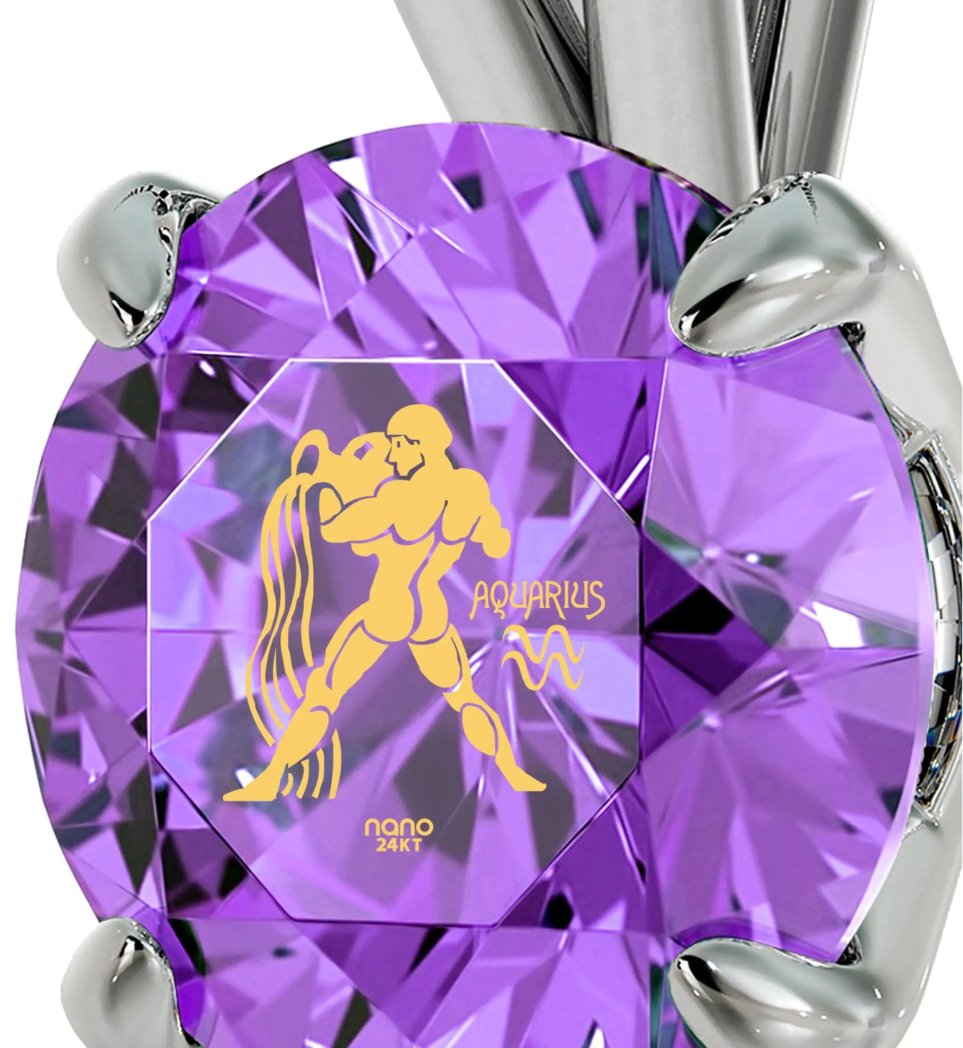 925 Sterling Silver Aquarius Necklace Zodiac Pendant 24k Gold Inscribed on Crystal