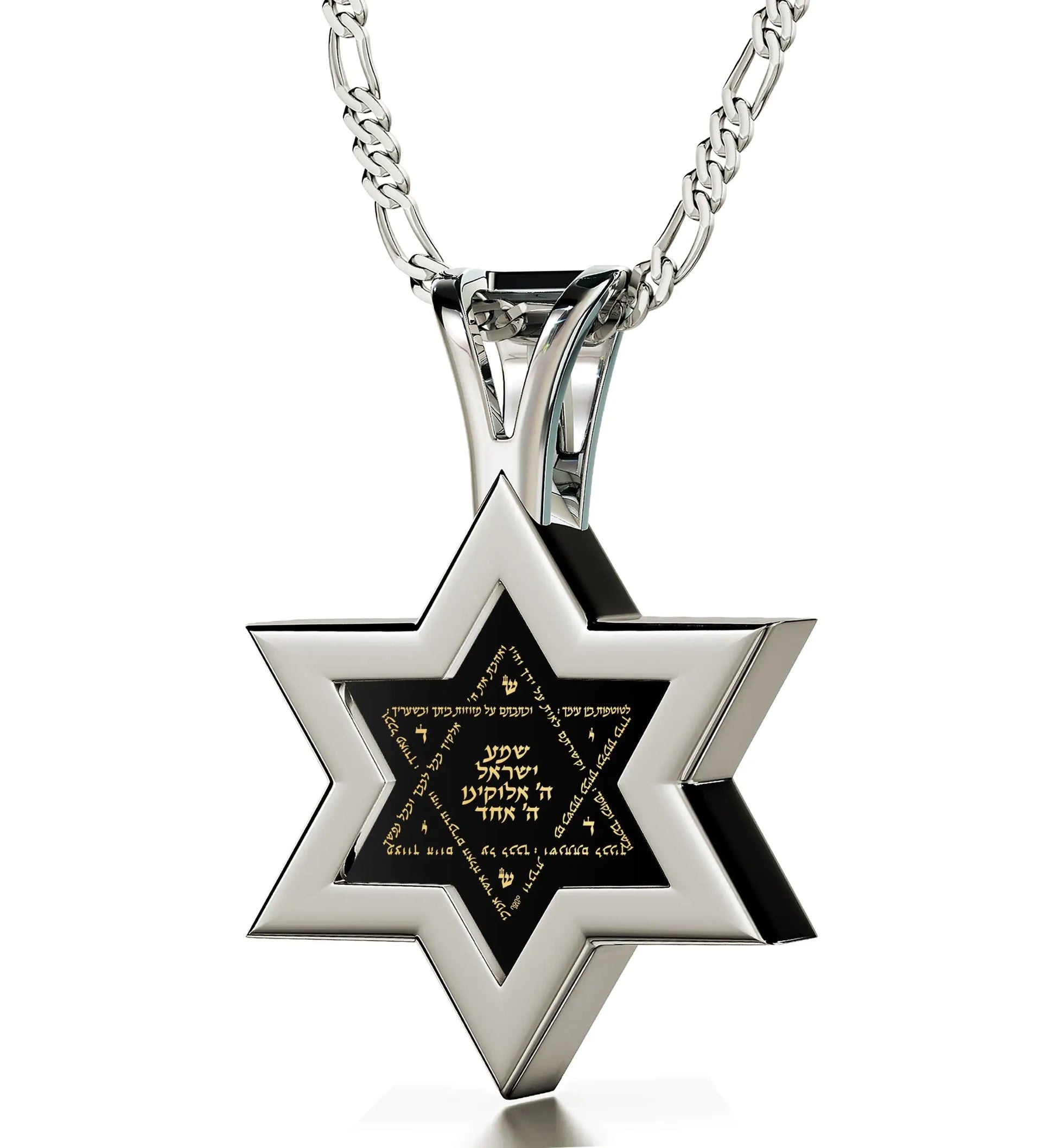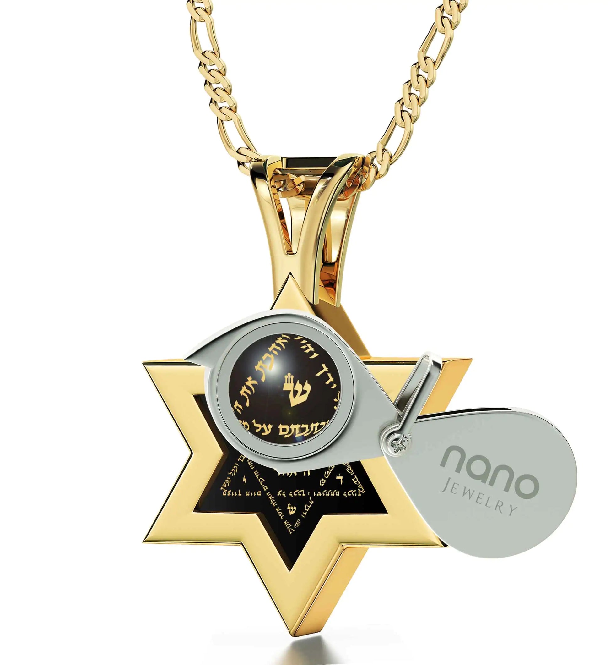 Men's Star of David Necklace 24k Gold Inscribed Shema Israel Pendant on Onyx